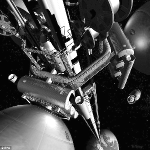 大林組計劃大約2025年開(kāi)始修建天梯,先發(fā)射火箭將兩卷用碳納米管和其他材料制成的纜索運至距地大約300千米的位置;再用宇宙飛船解開(kāi)纜索,朝地面放去;與此同時(shí),飛船繼續飛升,攀至9.6萬(wàn)千米高處。這一高度大約是地球與月球距離的四分之一。