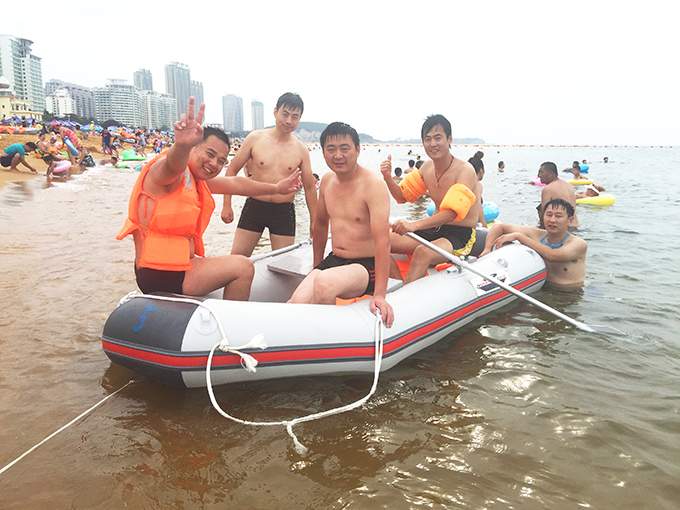 吃過(guò)午飯,我們一行人來(lái)到了威海國際海水浴場(chǎng),不愧是國際海水浴場(chǎng),灘緩沙細,水質(zhì)清澈,松林環(huán)繞?;ú?、石雕點(diǎn)綴于岸邊,令人新曠神怡。看著(zhù)那迷人的海灘和不斷奔涌而上的浪潮,遠處氣勢磅礴的海面卷起的層層浪花,走在沙灘上,感受著(zhù)浪花在腳上一次次的沖刷。換上泳衣,租個(gè)皮劃艇,同事們迫不及待的開(kāi)始下水了。