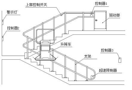 斜掛式輪椅升降機主要為使用輪椅者提供上下樓梯的服務(wù),其一般結構型式如下圖所示。為了防止平臺傾翻,設2根導軌。斜掛式輪椅升降平臺主要由工作平臺、支承架、護欄組成,主體是鋼結構。工作平臺是升降機的工作部分,表面復有防滑材料。平臺的3個(gè)外向面都安裝有安全護板,當平臺運動(dòng)受阻時(shí),能使升降機停止運動(dòng)。平臺在不使用時(shí)可以向上折疊,以減少占用空間。
